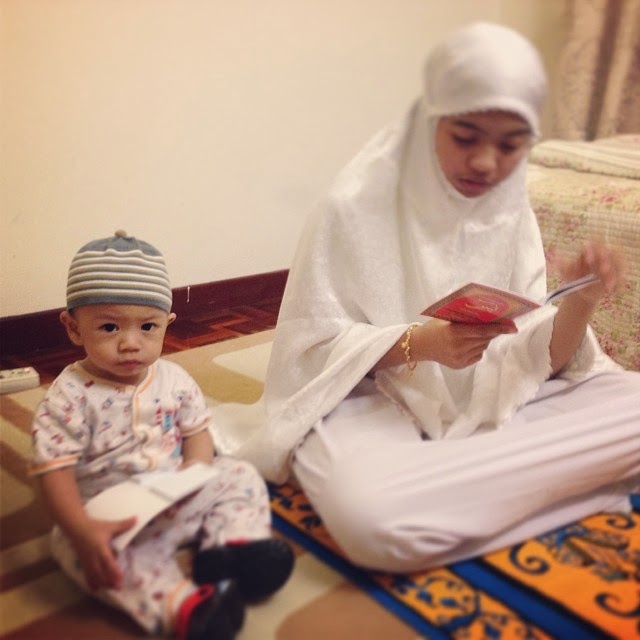 Lepas Maghrib ibu baca Yassin, ayah pula baru nak solat Maghrib.. Nak bagi si kecik duduk senyap xpegi maner2,ayah pakaikan kopiah,bg buku nota satu terus senyap...hehe behave anak ibu nie.. Lepas ibu habis baca yassin,suruh dia tadah tangan baca doa..terus takmau suruh ibu buka telekung sebab nak peluk...aisehhh man..